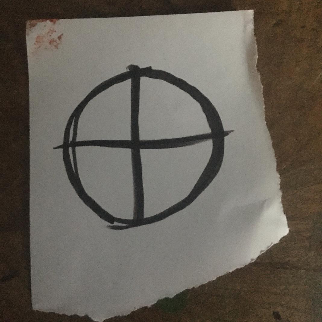 paper (grid or white), a black marker, some thread and a needle, and some matches. Since this ritual is dealing more with your mind’s strength and less your physical body’s, the symbol must be marked slightly differently, but it is of very simple design; a circle with a cross running through the centre. An example has been provided. There are two options to mark the symbol down. The first is to draw its shape on both of your eyelids, as you cannot draw on your eyes (safely) and therefore this is the closest you will get between the channel of interpretation and your mind. You may use a mirror to help with this. However, should this be too difficult (or should you be lacking eyelids, possibly after having failed a previous ritual), you must then use your own body’s essence. Prick your finger with the threading needle to draw the symbol with your blood on the paper. Regardless of how you drew the symbol, the ritual will now recognize you as the participant.